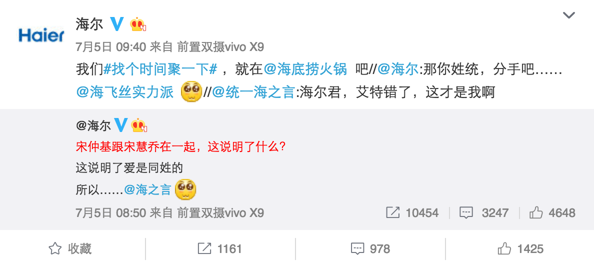 海爾搶熱門的能力在前幾天宋仲基宋慧喬公布戀情時,再次得到了印證。海爾迅速get到了宋仲基和宋慧喬同姓的點,發微博@和自己同姓的品牌強行組CP,同姓組CP這個點也很容易被模仿,藍V參與度也異常高漲,比如"海信@海天醬油"、白貓凈界@白敬亭"等等。